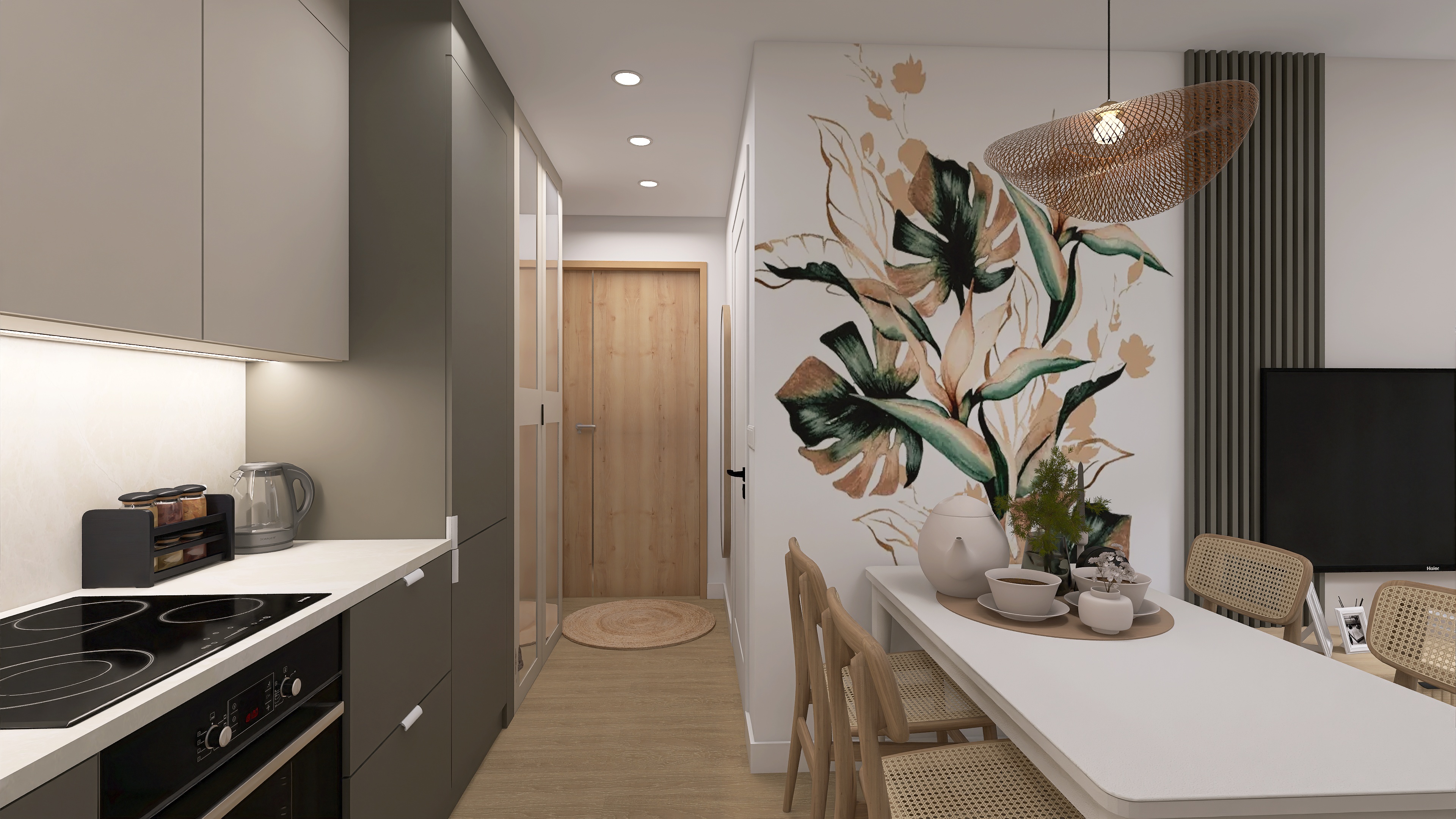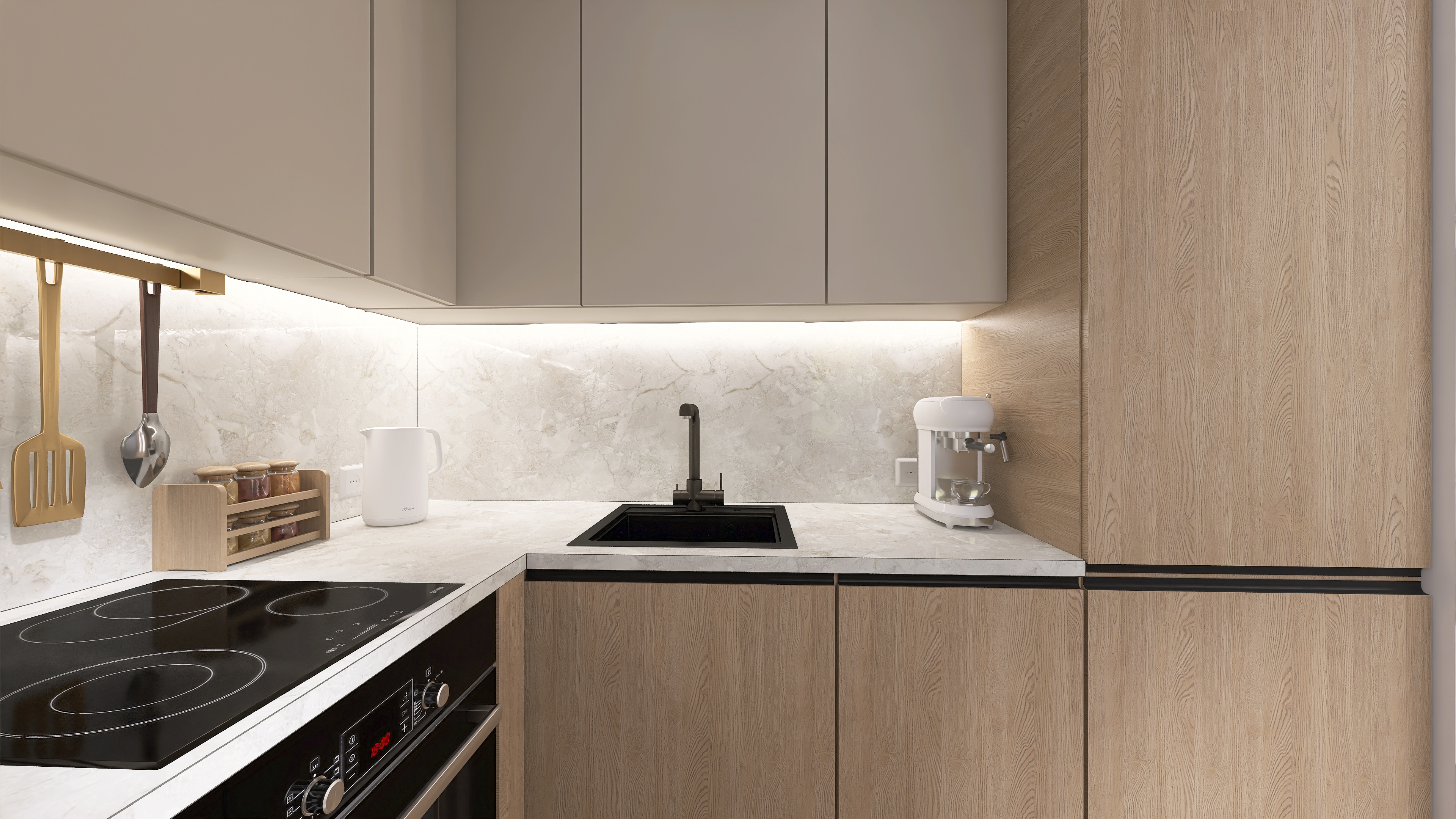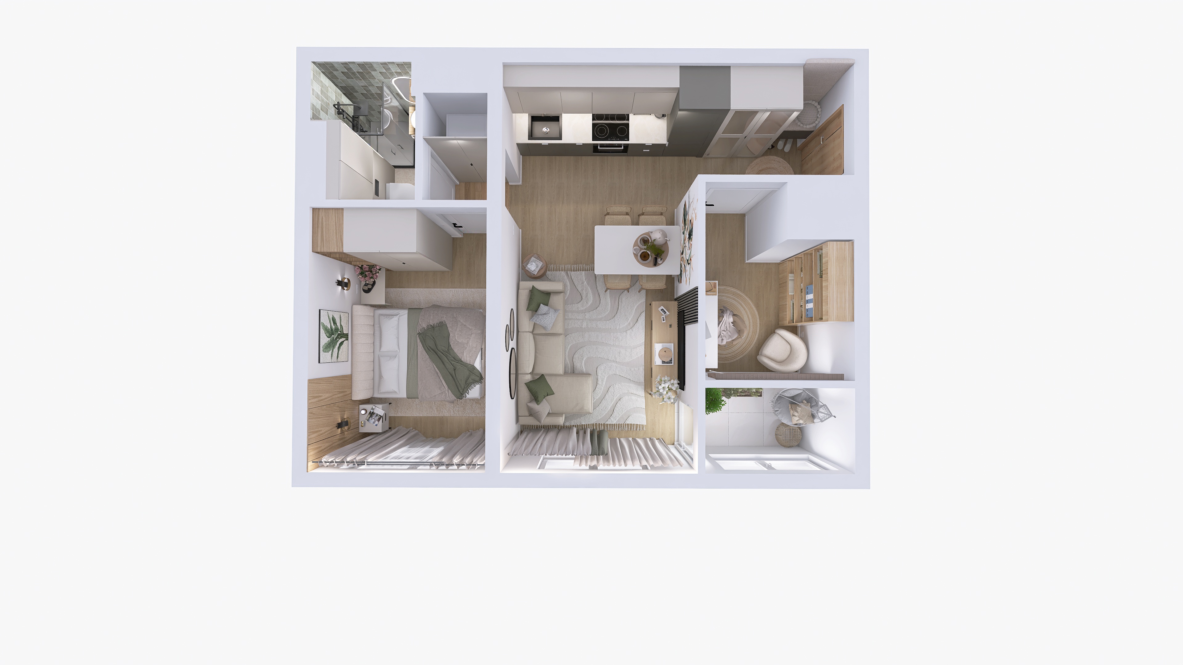 Функціональне планування включає: вітальню поєднану з кухнею, окрему спальню та ванну кімнату з підігрівом підлоги. Додатково LED-карнизи, меблі на замовлення та повне оснащення сучасною технікою; інтер’єр виконано у м'яких тонах з використанням якісних матеріалів.