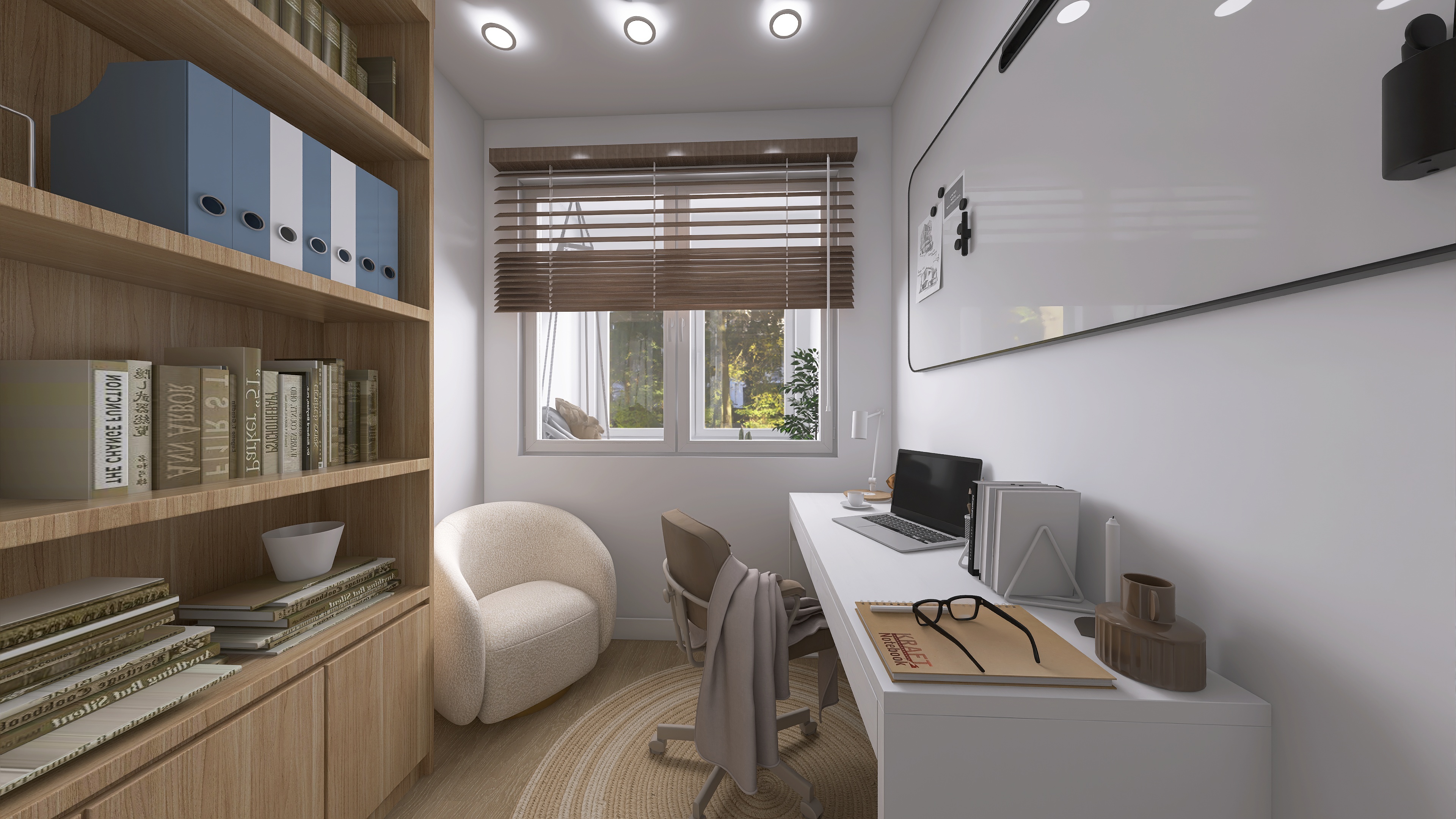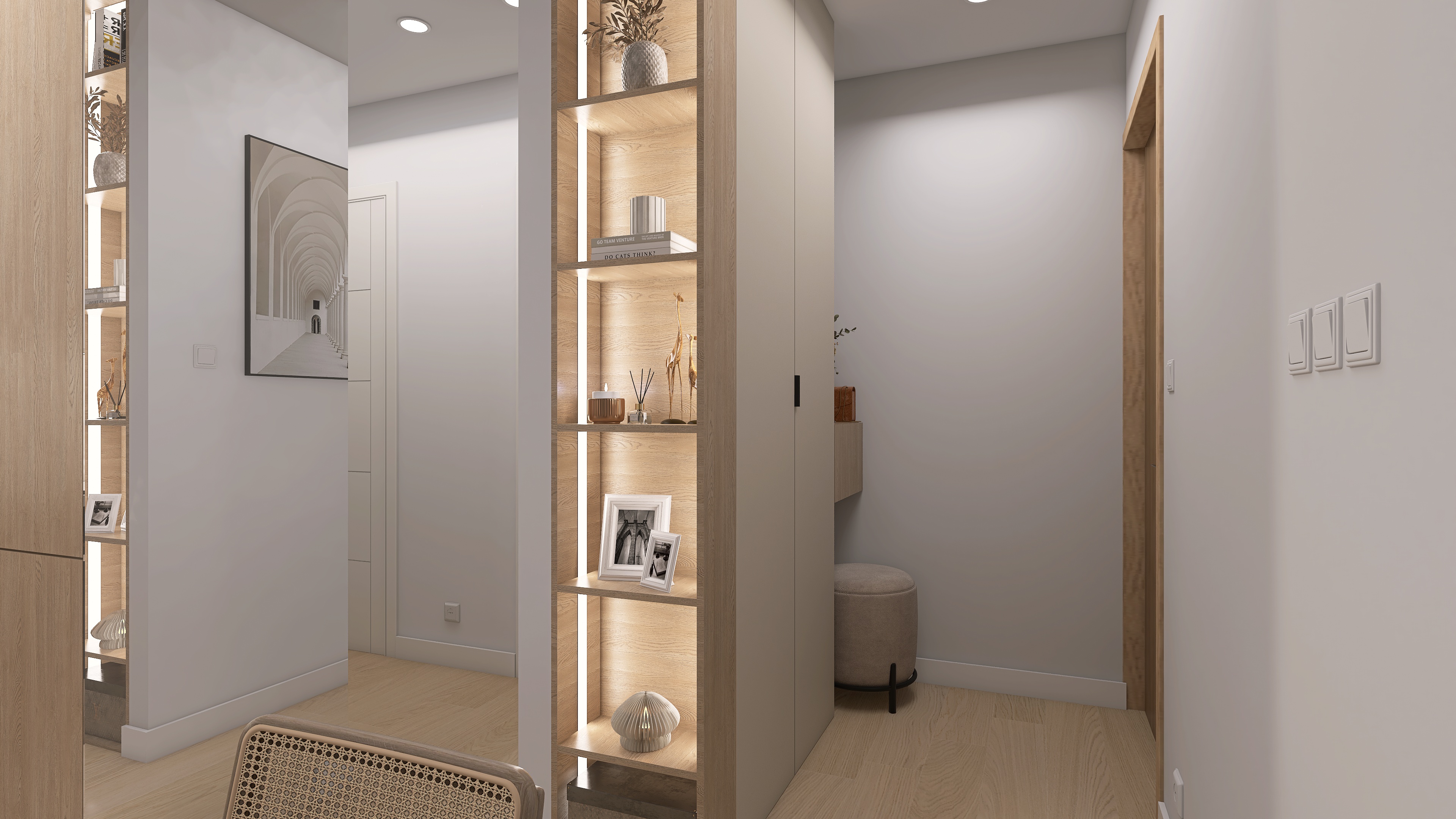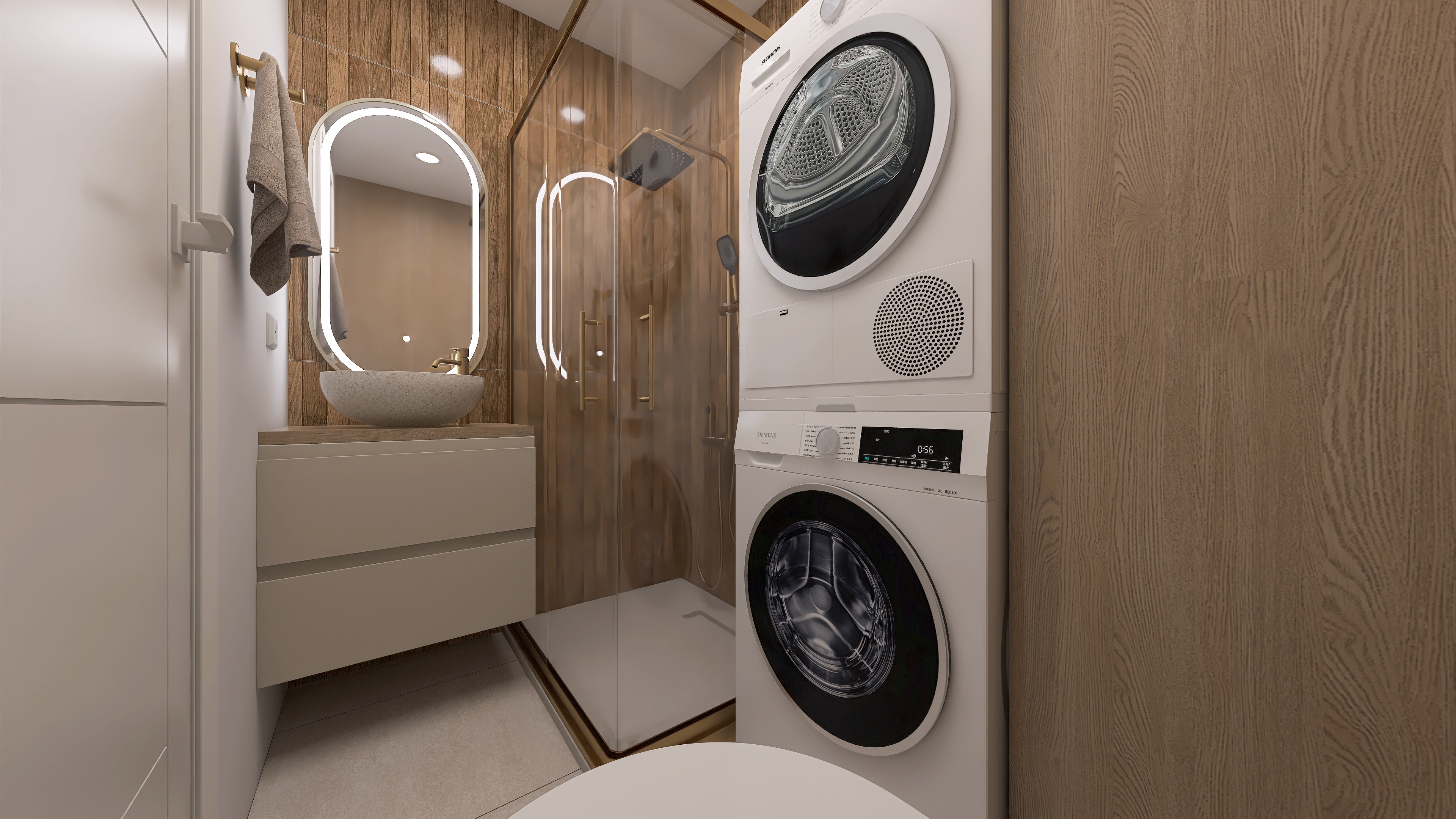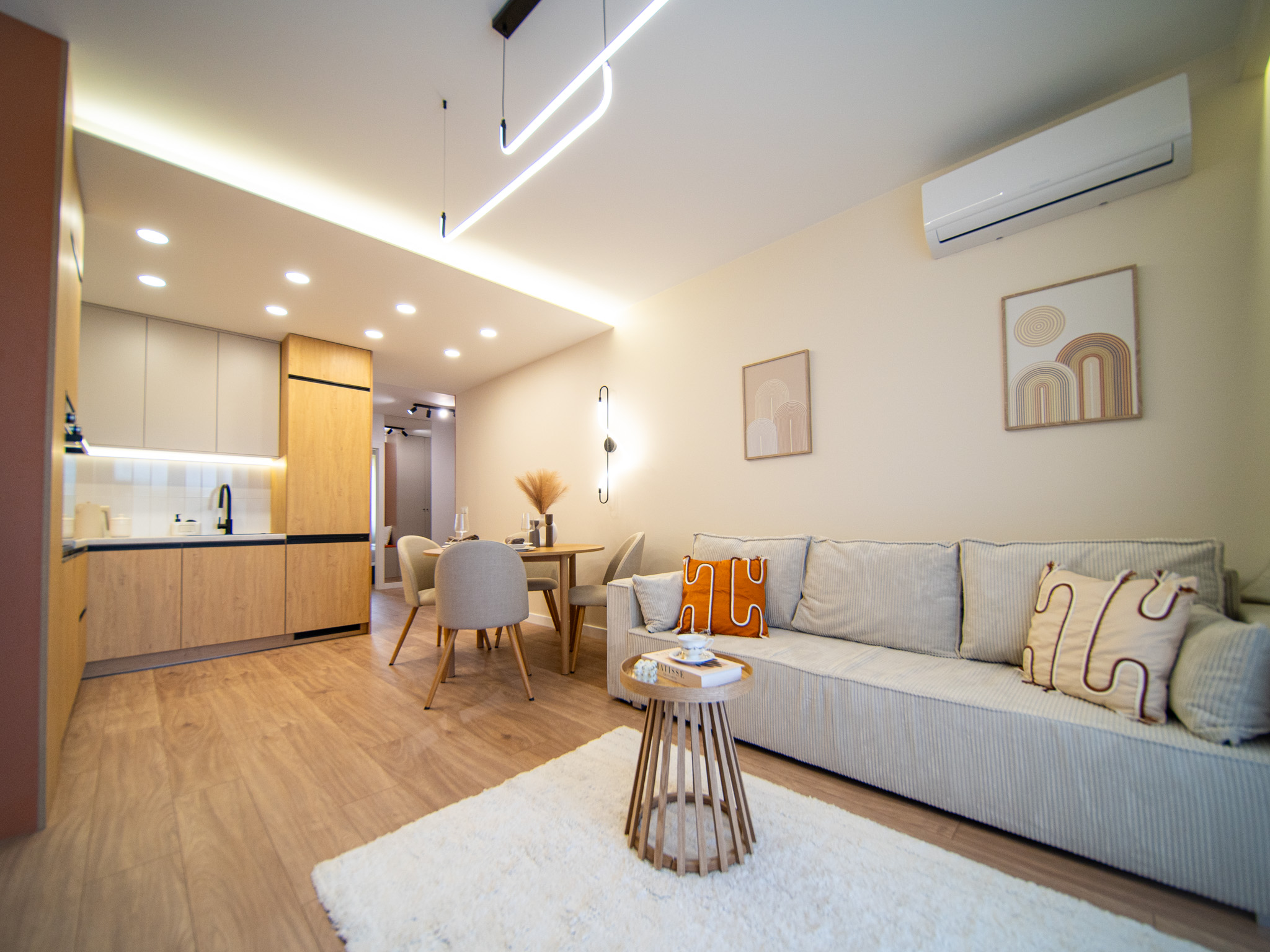 Функціональне планування включає: вітальню поєднану з кухнею, окрему спальню та ванну кімнату з підігрівом підлоги. Додатково LED-карнизи, меблі на замовлення та повне оснащення сучасною технікою; інтер’єр виконано у м'яких тонах з використанням якісних матеріалів.