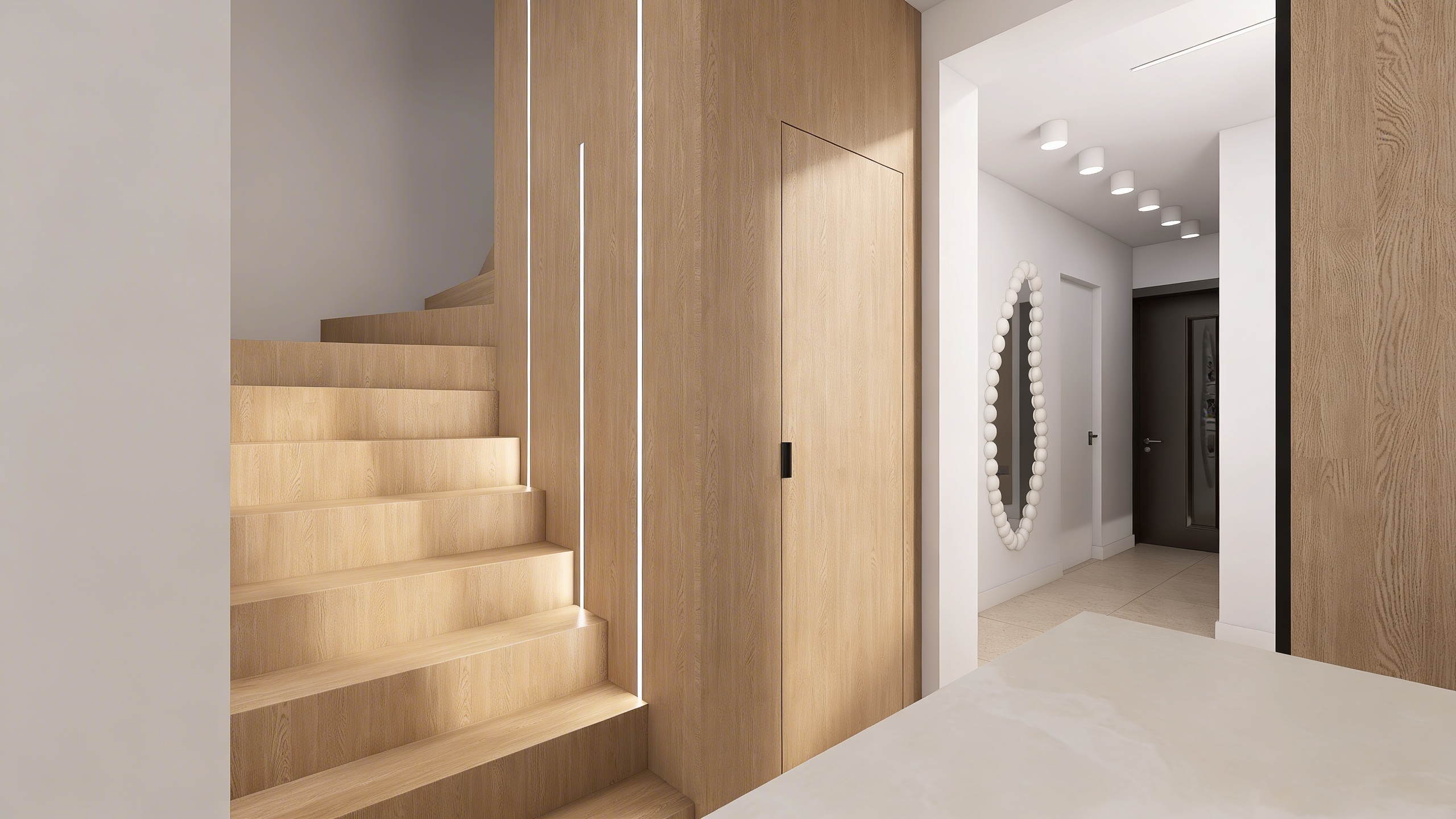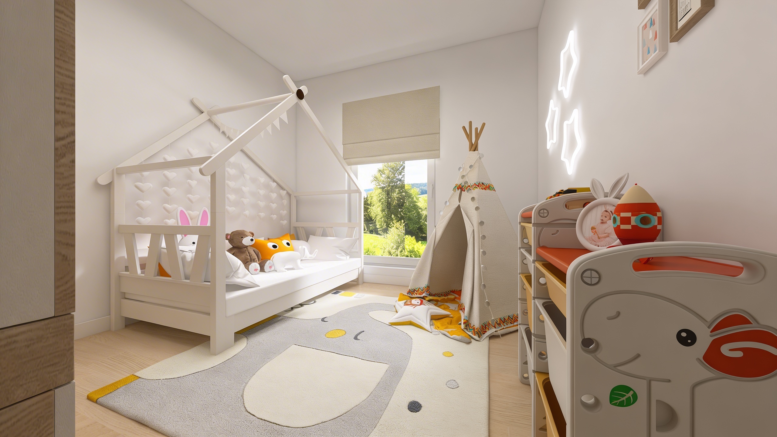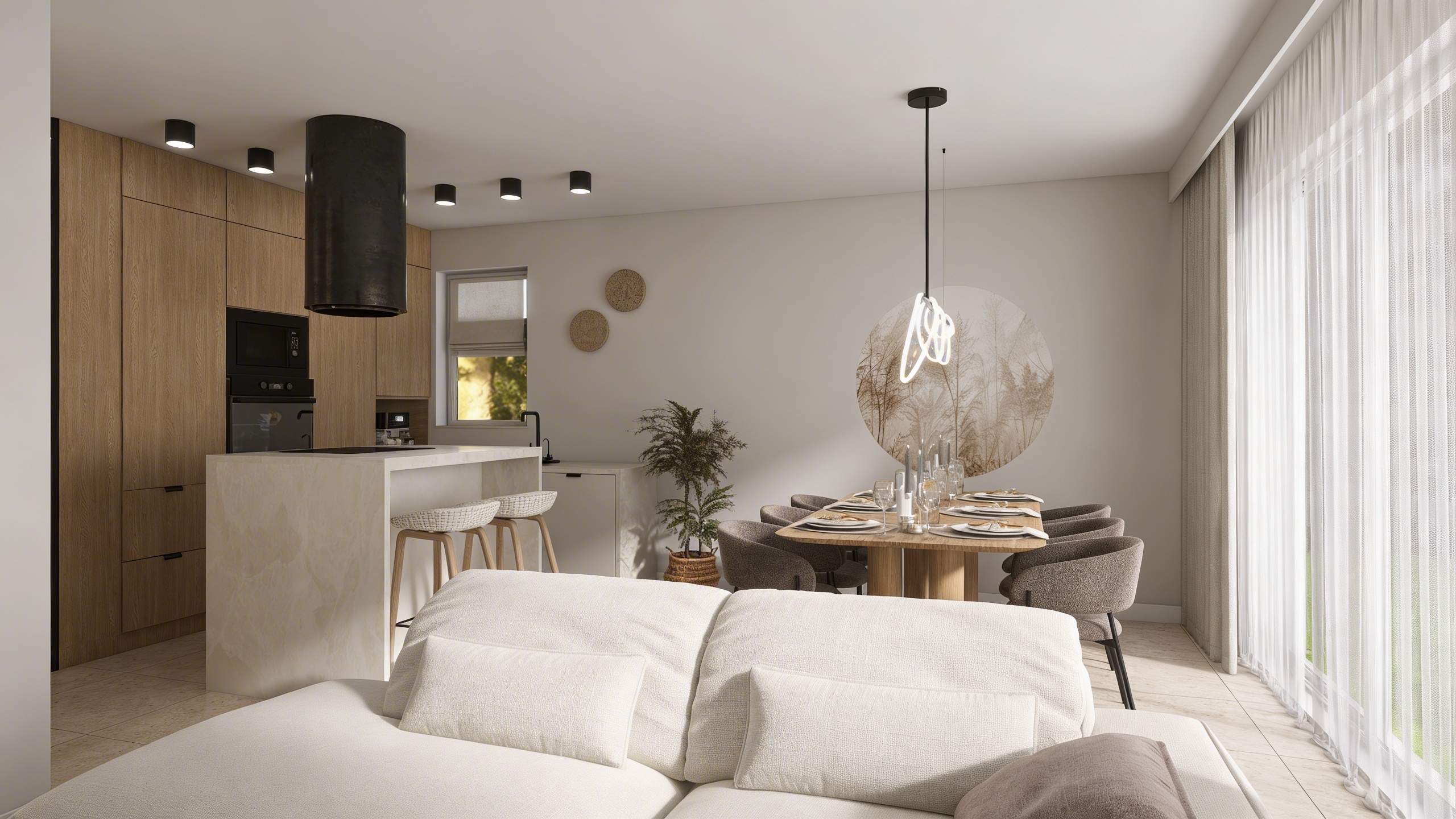 Інтер’єр спроєктований з урахуванням максимального комфорту: просторий перший поверх із майже п’ятиметровим панорамним склінням у вітальні та функціональний другий поверх без незручних скошених стель. Будинок вирізняється високим стандартом оздоблення, що включає меблі, виготовлені на замовлення, сучасні карнизи LED, а також енергоефективні рішення, такі як теплова помпа Daikin, кондиціонування та підготовка під встановлення сонячних панелей.
