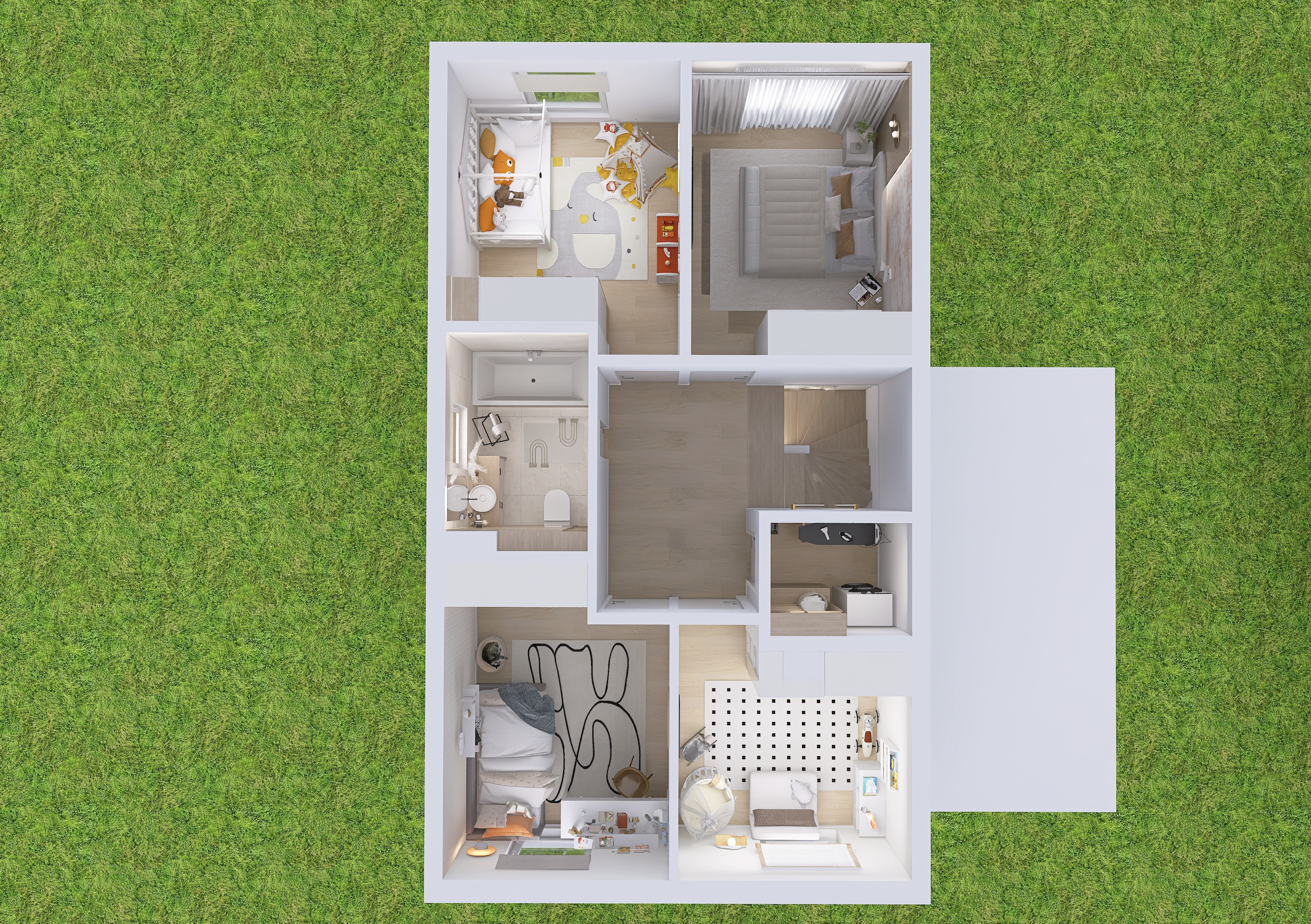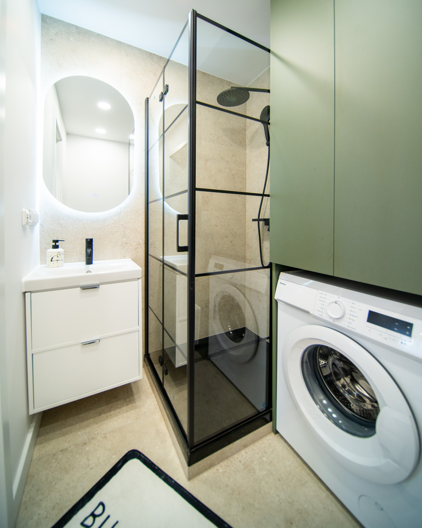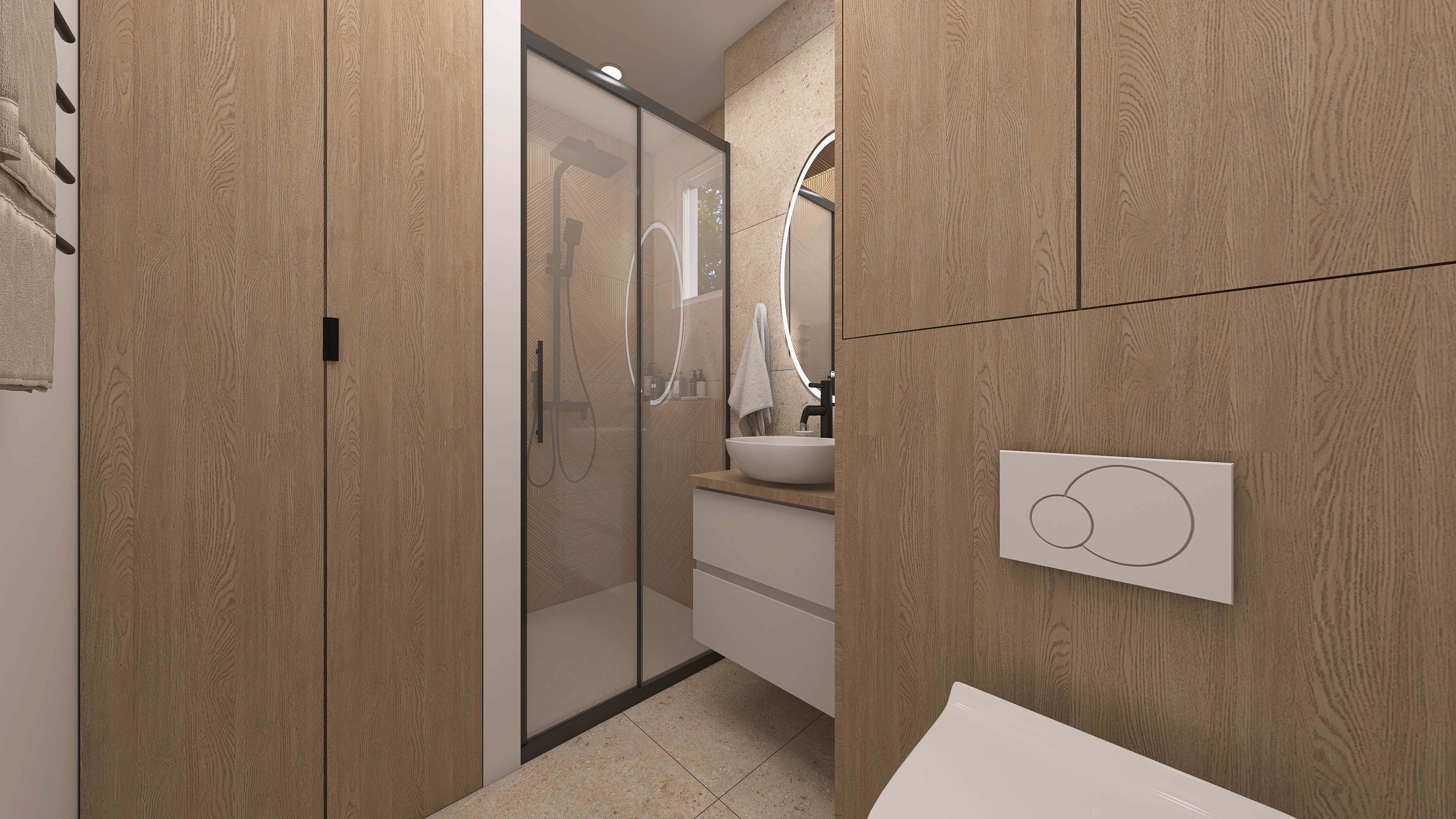 Інтер’єр спроєктований з урахуванням максимального комфорту: просторий перший поверх із майже п’ятиметровим панорамним склінням у вітальні та функціональний другий поверх без незручних скошених стель. Будинок вирізняється високим стандартом оздоблення, що включає меблі, виготовлені на замовлення, сучасні карнизи LED, а також енергоефективні рішення, такі як теплова помпа Daikin, кондиціонування та підготовка під встановлення сонячних панелей.